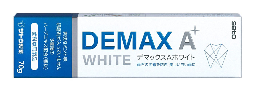 歯垢の除去、口臭を防ぐ「デマックスA」 研磨剤不使用で基剤に重曹を配合し、天然のハーブ(カミツレ・ラタニア・ミルラ)を配合したナチュラル志向の歯磨剤です。 スッキリとした使用感です。 歯石の沈着を防ぎ、美しい白い歯に「デマックスAホワイト」 研磨剤不使用で基剤に重曹を配合し、天然のハーブ(カミツレ・ラタニア・ミルラ)を配合したナチュラル志向の歯磨剤の「デマックスA」にポリリン酸ナトリウムを加え歯の汚れを落とす働きをプラスしたホワイトニングタイプです。 スッキリとした使用感です。